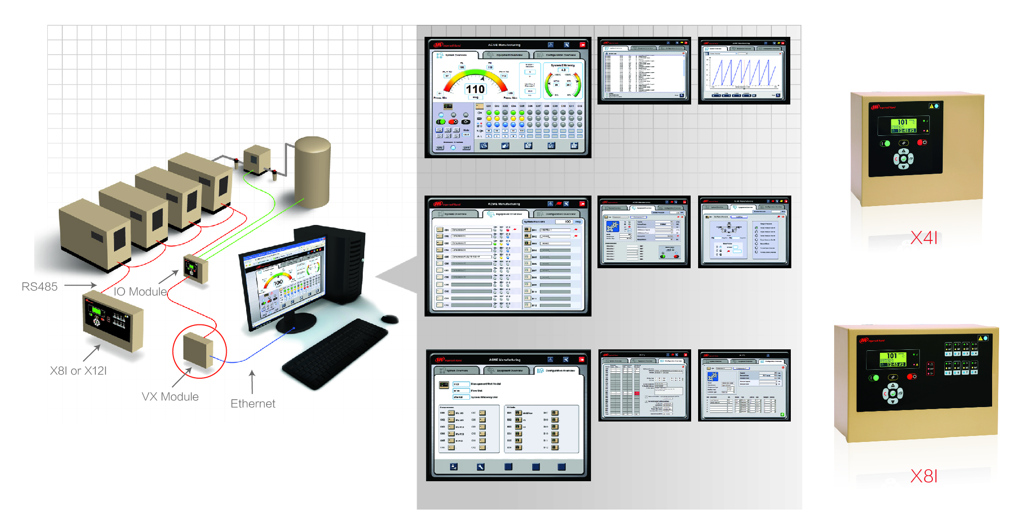 英格索蘭X4I\X8I多空壓機組聯動控制系統可以幫助用戶降低運行成本,而且可以保持充足和高效的空氣供給。通過控制功能及廣泛的連接性能,多空壓機組聯動控制系統可以與用戶包括英格索蘭和其它廠家制造的壓縮機進行連接,提高設備的運行效率,并且降低能源成本。多空壓機組聯動控制器系統通過以下方式確保壓縮機的高效配置和可靠性: