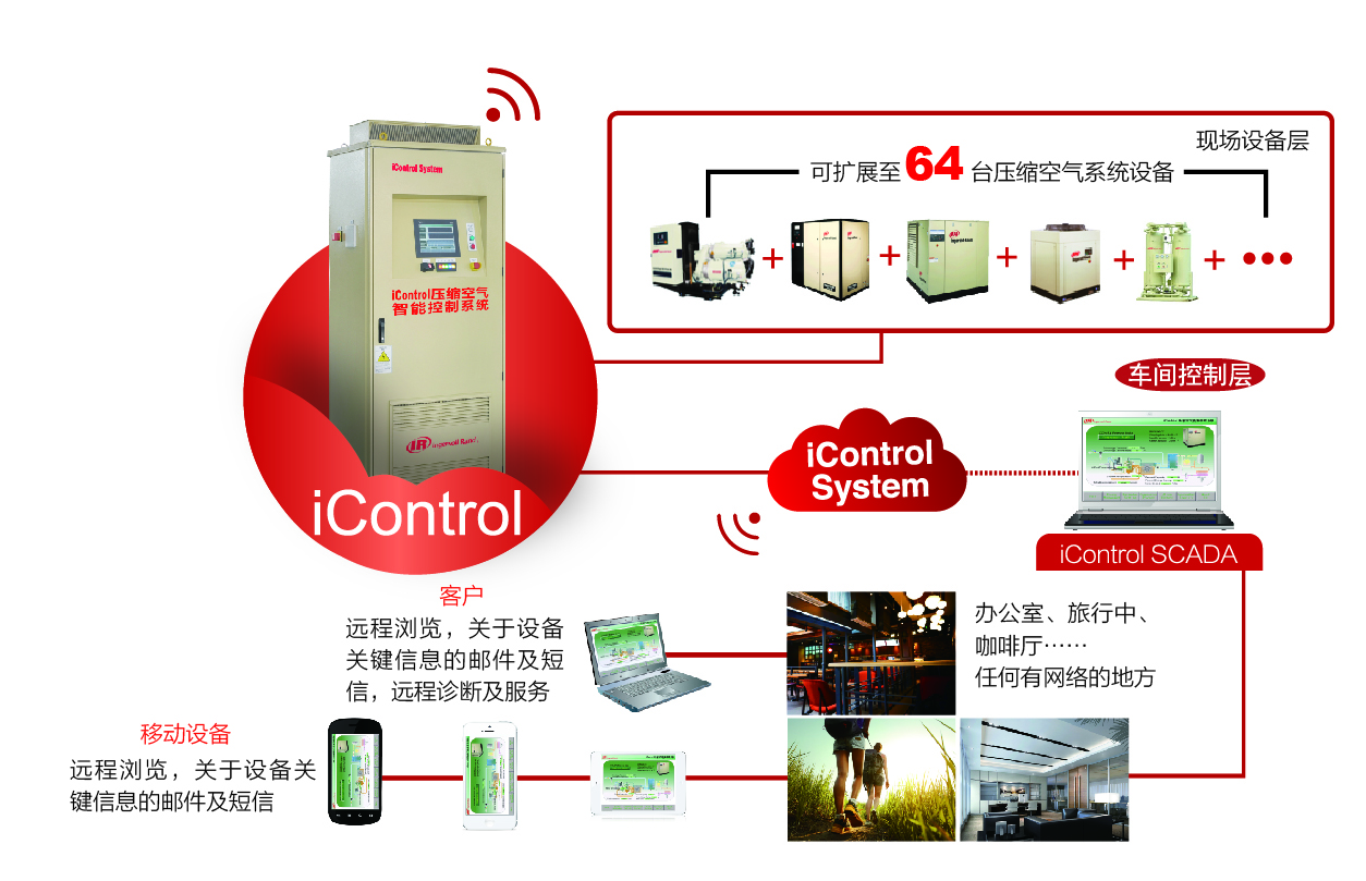 iControl是壓縮空氣系統節能和穩定運行開發的遠程智能管家,實現了集中控制和無線傳輸的完美結合,是IR百年技術積累和物聯網融合產物。它是壓縮機控制、壓縮機各種狀態、故障信息、實時顯示報警的解決方案;可實現遠程瀏覽、遠程數據采集等功能,給予客戶最即時信息,讓客戶和IR進行信息的全面溝通。